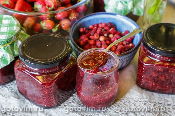 Варенье-пятиминутка из лесной земляники получилось густым и очень душистым. Специально показываю, как оно выглядит на ложечке. Количество сахара для варенья в разных рецептах варьирует от 0.5 до 1кг. Но для хранения земляничного варенья при комнатной температуре лучше сахара не жалеть. Иначе есть шанс, что варенье забродит.